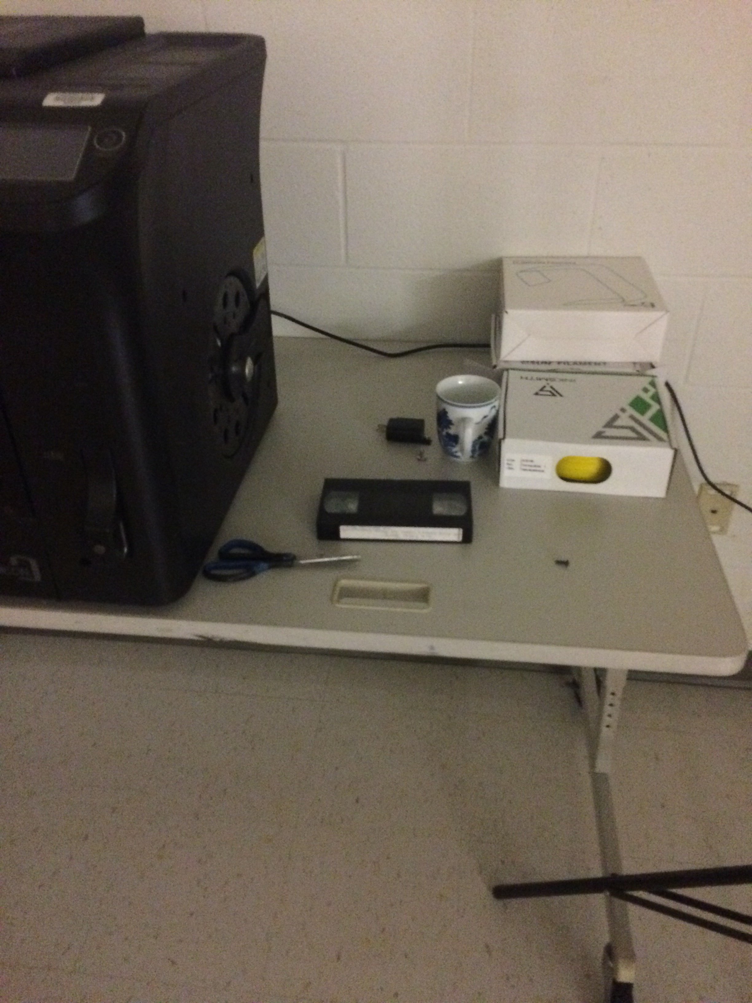 An unexpectedly placed VHS tape in a classroom.
